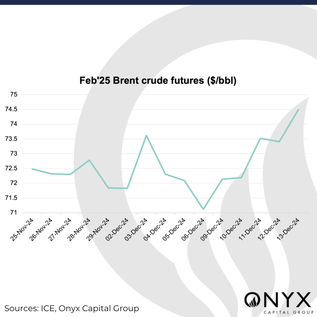 The front-month (Feb’25) Brent futures contract has seen a supportive performance in the past week, rising to highs of $74.50/bbl on 13 December – but has come off to the $74/bbl level on 16 December (time of writing). This week, we anticipate price action to correct lower to the $71–73/bbl level as the market evaluates the following factors: