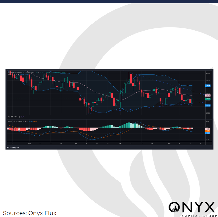 The global economy’s health remains a concern, with pessimism dampening the demand picture and array of fundamental balances, including OPEC+ reducing their demand outlook last week. China is the primary concern, although China’s latest data presents a mixed picture: industrial production growth in October slightly underperformed at 5.3% (below the 5.6% forecast and 5.4% previous), while retail sales surged, beating expectations with a 4.8% rise (well above the 3.8% estimate and up from 3.2% previously). Meanwhile, house prices continued to decline in October, though the pace of the drop has slowed. This shows the possibility that China’s economy has begun to stabilise somewhat. However, one month of data does not guarantee a trend. In the US, Jerome Powell was less dovish, indicating that the Fed is not hurrying to cut rates, which helped increase dollar strength and pushed the odds of a 25bp rate cut lower. There is less than a 60% chance of a cut on 18 Dec.