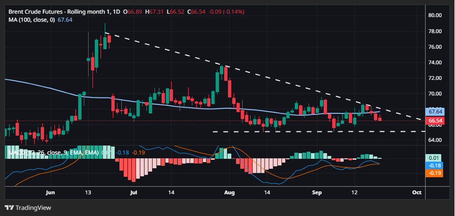 The technical analysis of M1 Brent futures shows a descending triangle pattern, indicating a broader bearish trend (white dashed line). The contract must pass through the previously strong resistance level of the 100-day moving average (blue line) to see any significant improvement. The Average True Range (ATR) has fallen to its lowest level since Q2 2024, highlighting the current low-volatility environment. Therefore, with volatility low and a lack of strong momentum in either direction, we may see the contract continue to trade within the bounds of the triangle ahead of a significant breakout, often preceded by extremely low volatility. It seems the path downwards has the least resistance.