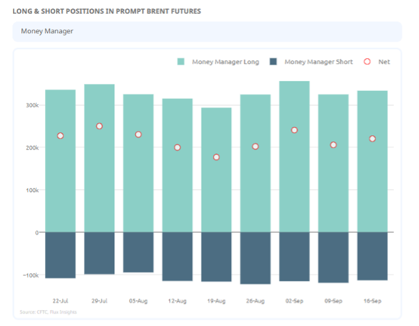 Looking at the COT data for Brent futures, net positioning is up in the week ending 16 Sep but failed to recover from the drop over the previous week. Although it was an unexceptional week in money manager positioning, the total OI in Brent futures sits at 2,974mb compared to a Sep 2020 – Sep 2024 average of 2,216mb and Sep 2020-24 max of 2,725mb. This high OI adds to the risk of a significant breakout mentioned above.