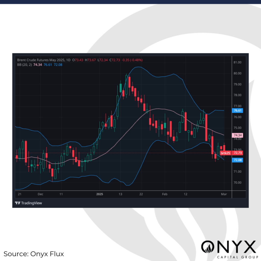 Lastly, ICE COT data for the week to 25 Feb showed speculative players parring length with a removal of 40.9mb of length (an 11.57% w/w drop). This brought managed by money outright length, and net positioning to their lowest level in 2025. This same exodus of long risk was seen in WTI futures, as the combined positions in WTI and Brent showed managed by money players removing 52.2mb (9.80% w/w drop) in the week to 25 Feb. There seems a lack of confidence in pre-empting policy and a movement to more neutral exposure in the wake of this. Onyx’s in-house CTA model shows net positioning dropped in the week from -10k lots to around -20k lots – which shows selling flow but there remains a lot of room in either direction to deploy risk – as this is far from an extreme level.