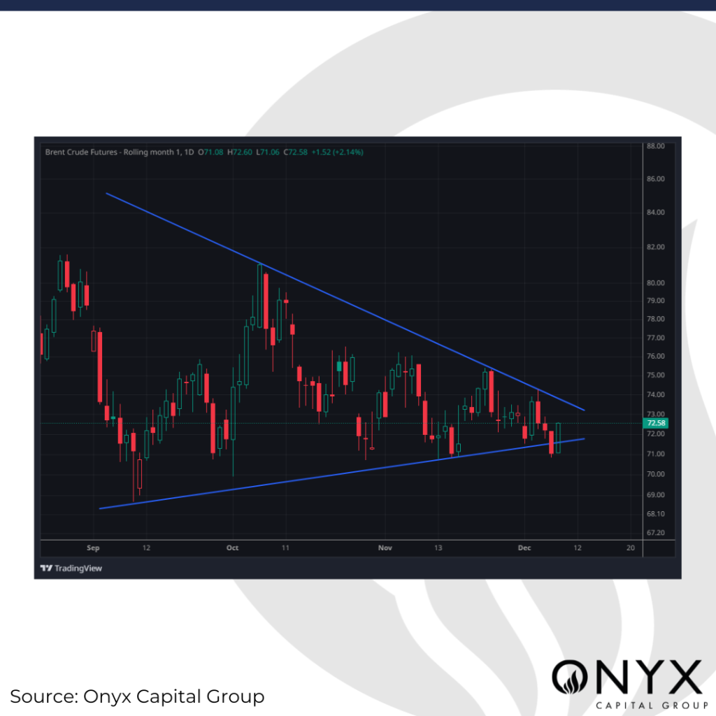 The front-month (February 2025) Brent futures contract weakened below $71/bbl on 06 Dec, dipping under the boundary of the symmetric triangle within which the M1 futures contract has oscillated since September (attached). As of Monday, 15:30 GMT (time of writing), the futures contract has climbed to $72.60/bbl, moving around this boundary. We expect Brent to close between $71/bbl and $74/bbl this week as the market evaluates the impact of the following three factors: