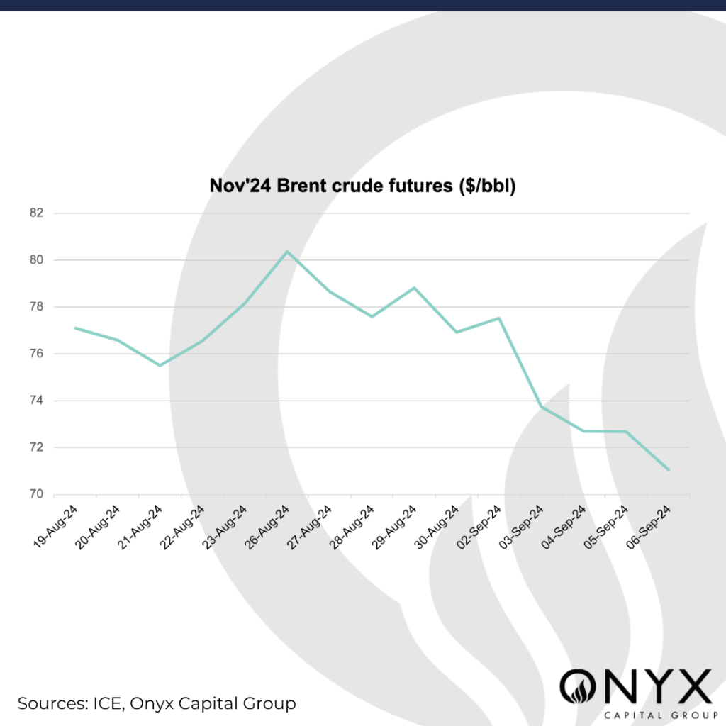 Brent crude futures saw a significant sell-off last week amid a weakening economic backdrop despite OPEC’s plans to delay its production hikes. The Nov’24 contract has stabilised at the $72/bbl level as of 09:00 BST (time of writing). While we expect no salvation for oil prices, we anticipate prices to remain above the $70/bbl level this coming week with a target of $71-74/bbl.