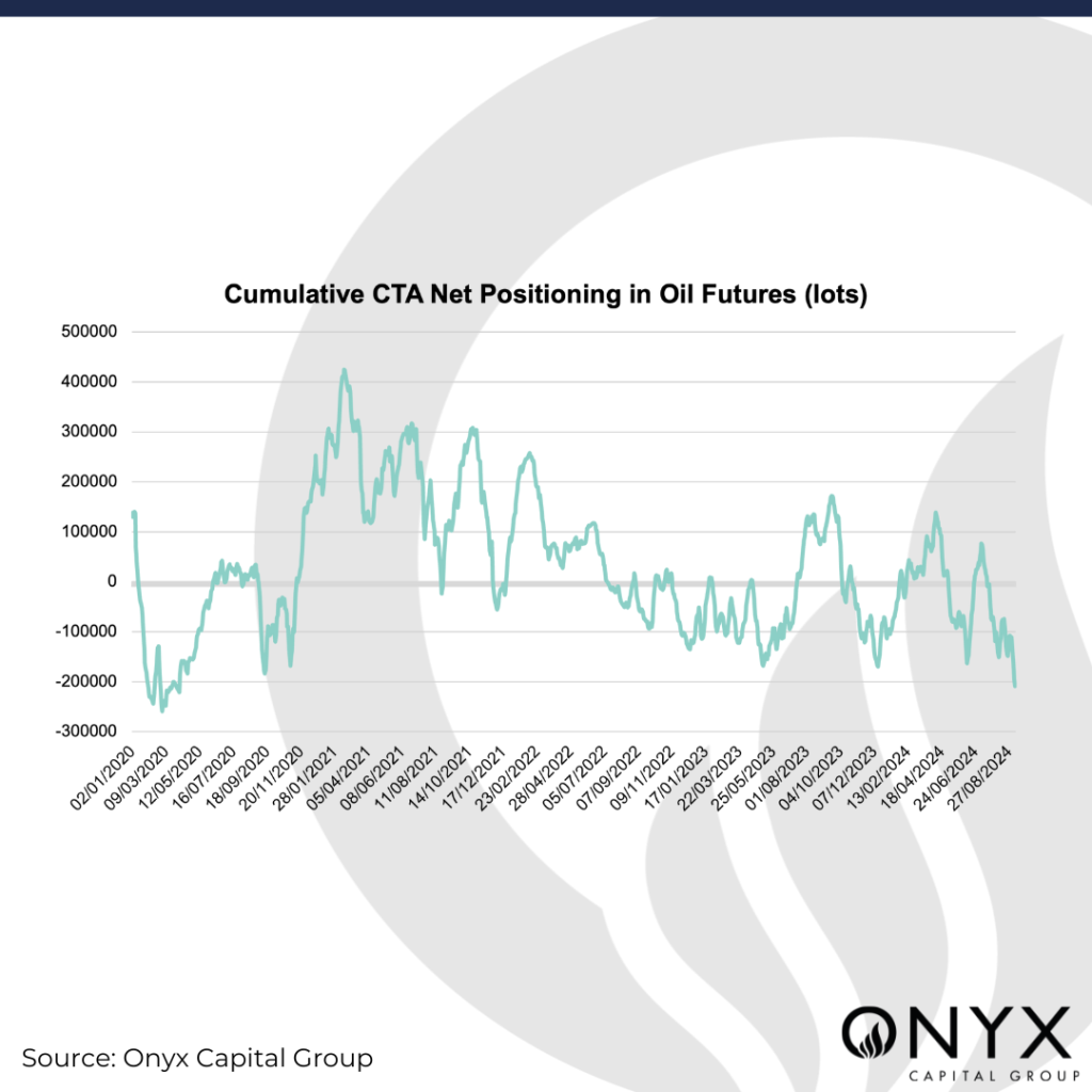 The latest CFTC COT data for the week ending 3 September indicates that money managers are historically short crude futures benchmarks. Combined positions in Brent and WTI futures reveal that net positioning is at the lowest level for over a decade. Bearish sentiment in WTI futures was the driver as its long:short ratio fell w/w from the 67th to the 21st percentile for all weeks since 2013. This comes as money managers redirect their attention from supply tightness concerns around the Cushing delivery point to questions of oil demand growth amid economic uncertainty. Meanwhile, Onyx’s CTA model reveals that net positioning in the oil futures benchmarks has fallen to the lowest level since March 2020, below -200k lots. This is a hugely bearish indication, as previous futures sell-offs in the past two years saw CTA positions bottoming out at around -160k lots. It has been speculated that some CTAs have increased their crisis alpha allocation, accelerating oil’s downside momentum. Nonetheless, with speculative crude shorts becoming crowded, they are vulnerable to reversal in the event of a bullish catalyst, such as geopolitical flare-ups or unplanned supply outages.