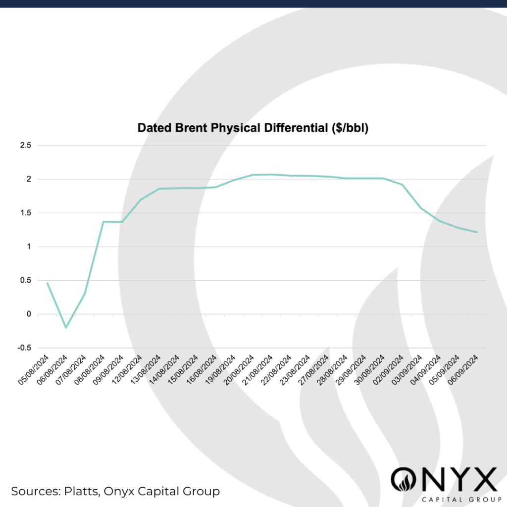 In tandem with the weakening futures market, the Dated Brent physical market has seen considerable downside pressure recently. Last week, multiple sellers emerged in the physical window as the supply situation improved, pressuring the physical differential down from $2.01/bbl to $1.21/bbl w/w. The tightness in the US market is easing, with WTI Midland setting the Dated Brent curve again. Moreover, economic uncertainty and weak refinery margins have weighed on sentiment, which may cause refiners to lower their utilisation levels. In addition, Dated-to-Frontline (DFLs) are in contango from the Jan’25 tenor, indicating expectations of an adequately supplied market. Although physical differentials have weathered previous sell-offs in Brent flat price, the weakening backwardation this time is a concerning bearish indicator, pointing to signs that the physical market is aligning with deteriorating crude fundamentals.