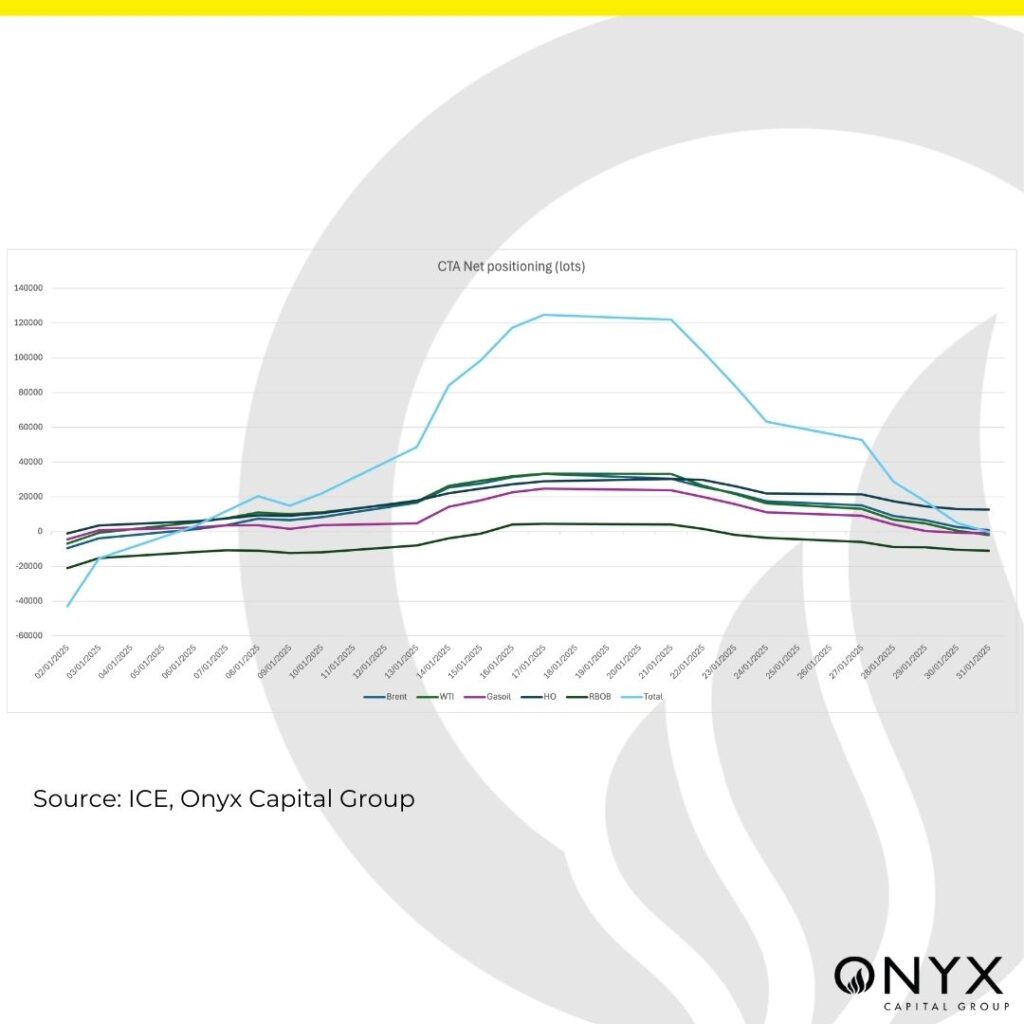 Looking to Onyx’s CTA net positioning model, the overall net positioning dropped into negative territory this week. Total estimated positioning fell from over 52k lots on 27 Jan to an estimated -258 lots on 31 Jan. This points to the weight of length added from CTAs over January being removed as the net positioning dropped to where it began the month. It seems likely that there will be further unwinding of positions from here.