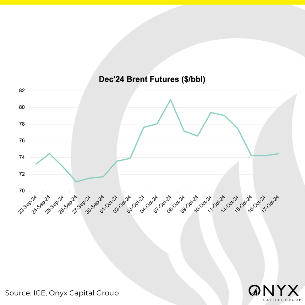 The Dec’24 Brent crude futures contract cratered by $3 overnight Monday (14 Oct) from around $77.50/bbl to $74.50/bbl, before trading rangebound for the remainder of the week between $74/bbl and $75/bbl. Prices are set for their biggest weekly decline since the week of 2 Sep. The key drivers influencing this week’s price action include: